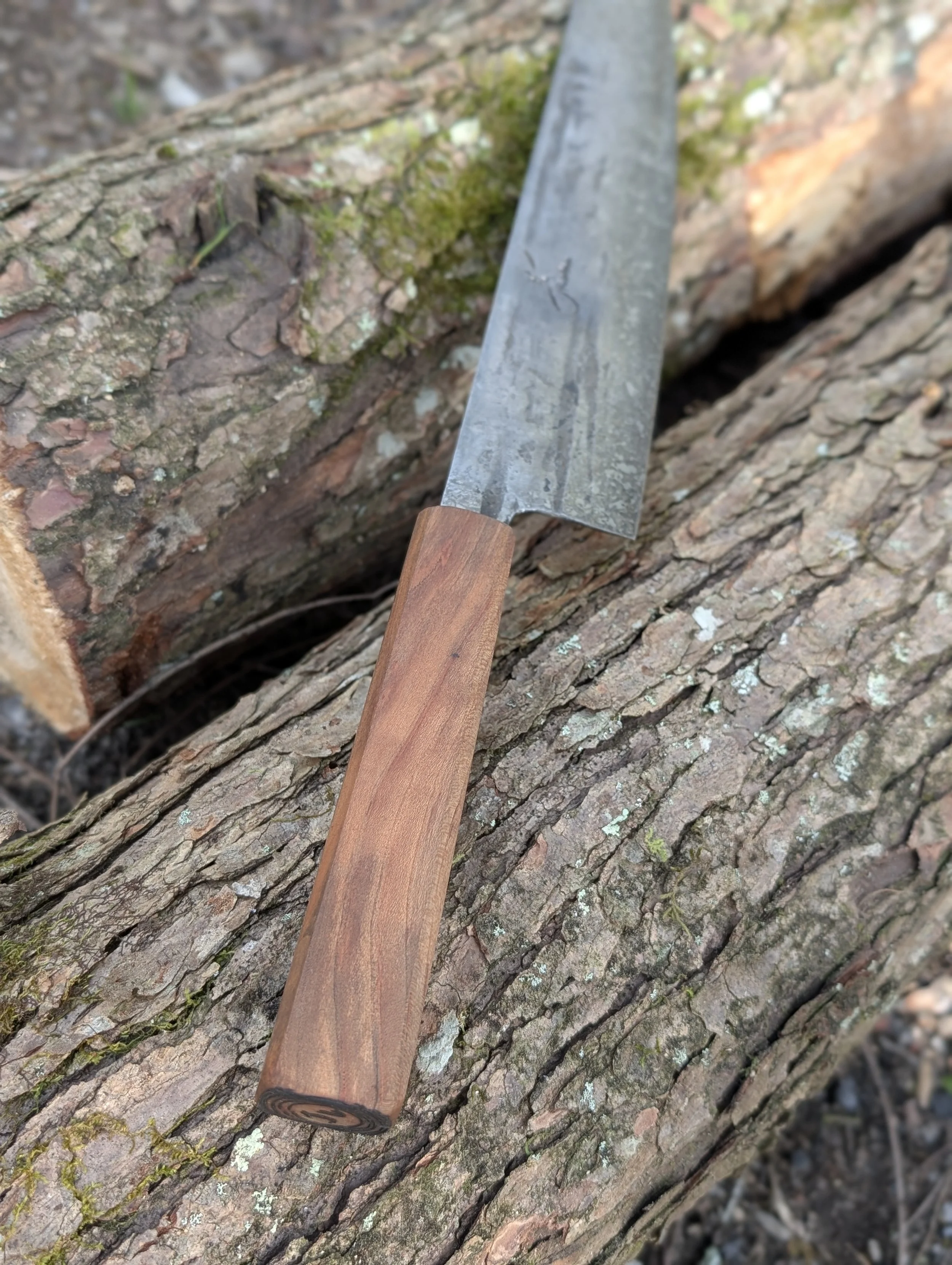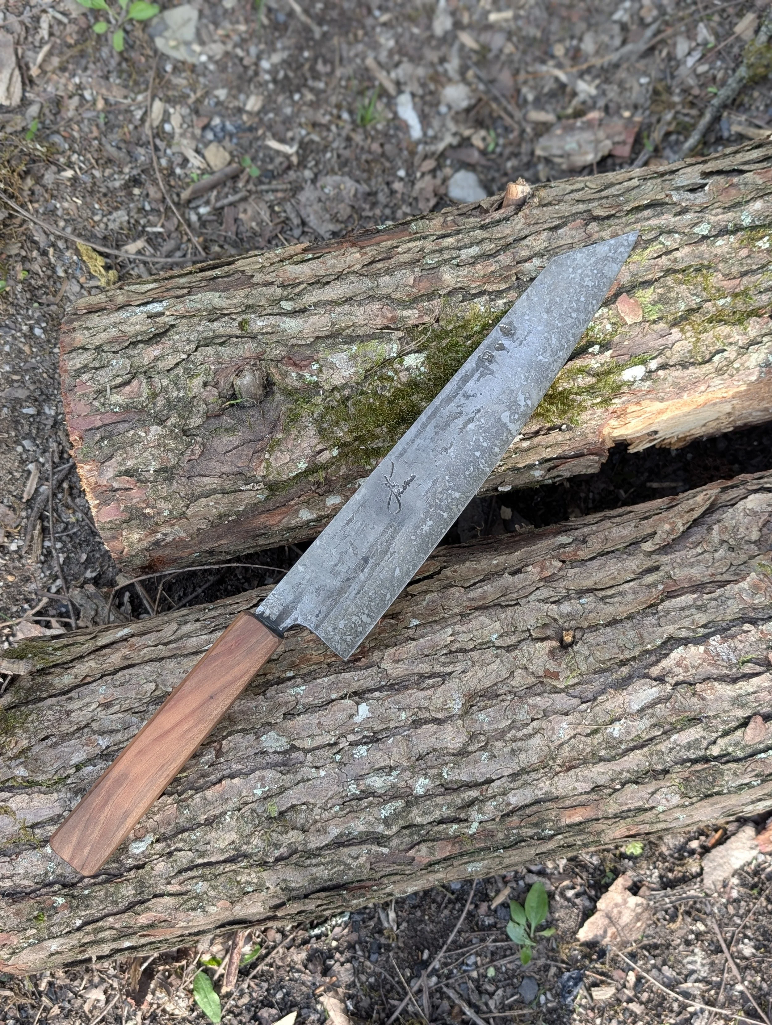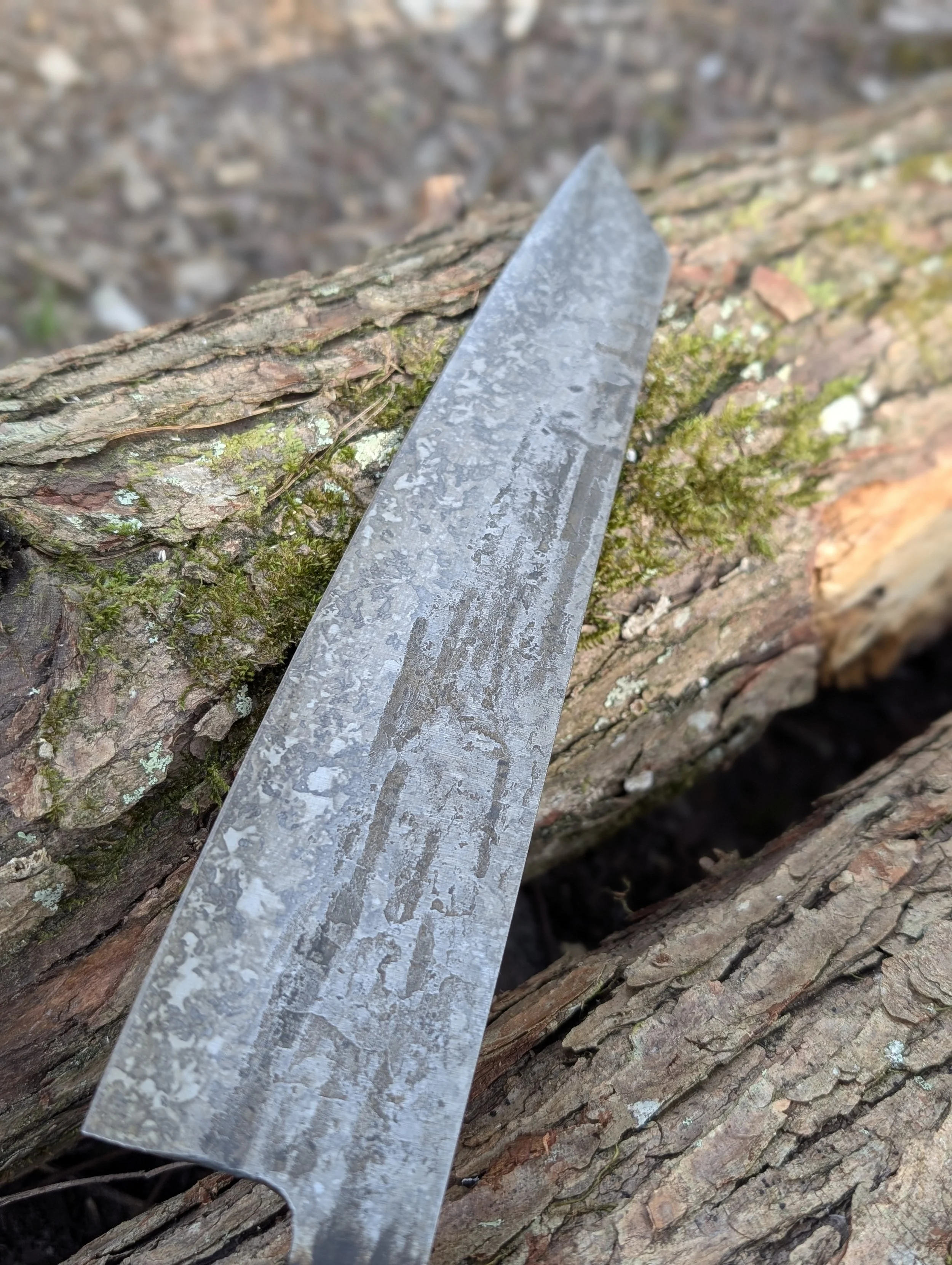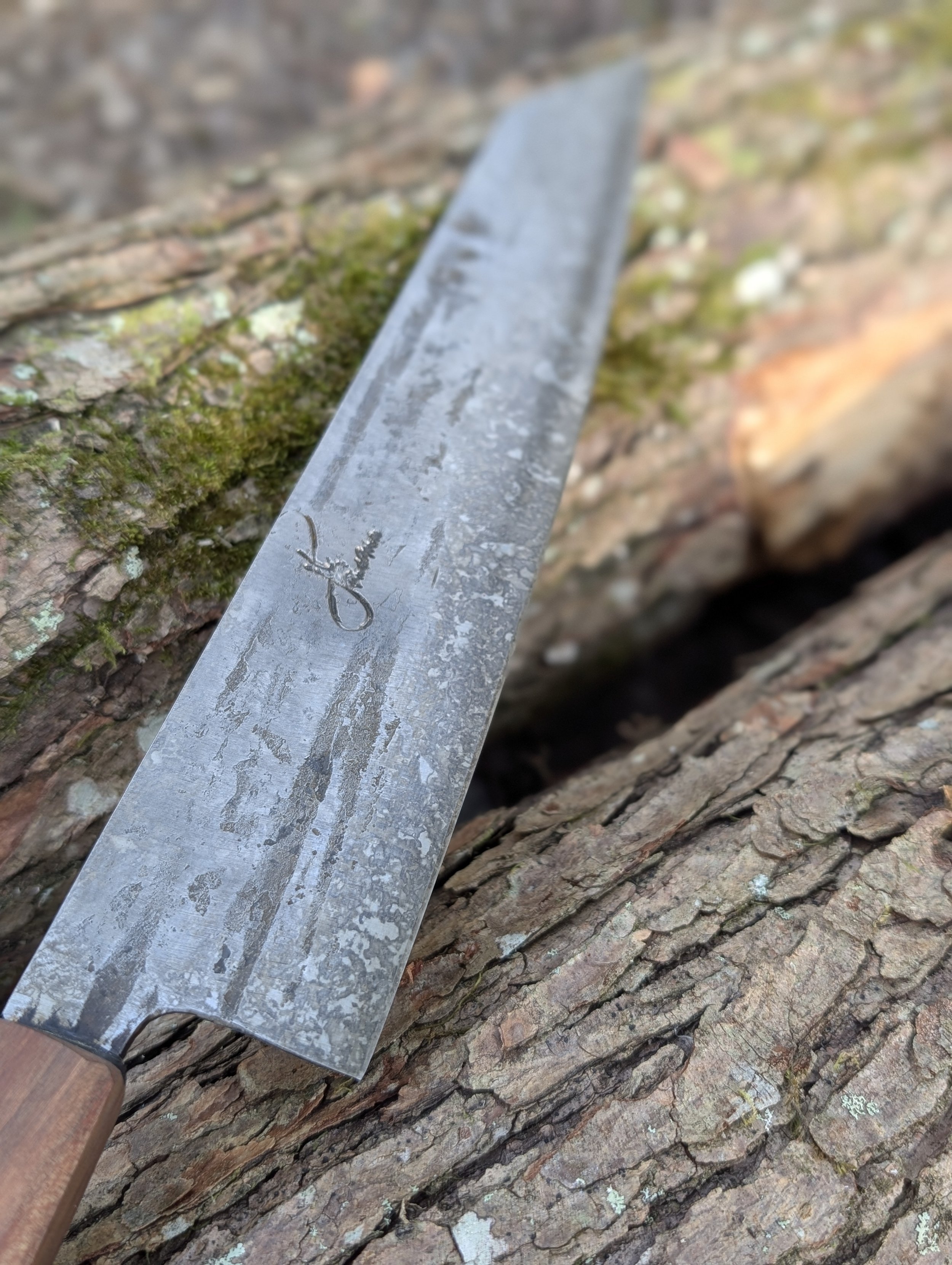 250 mm laser bevel kiritsuke forged from 1084 high carbon steel and mustard etched.
