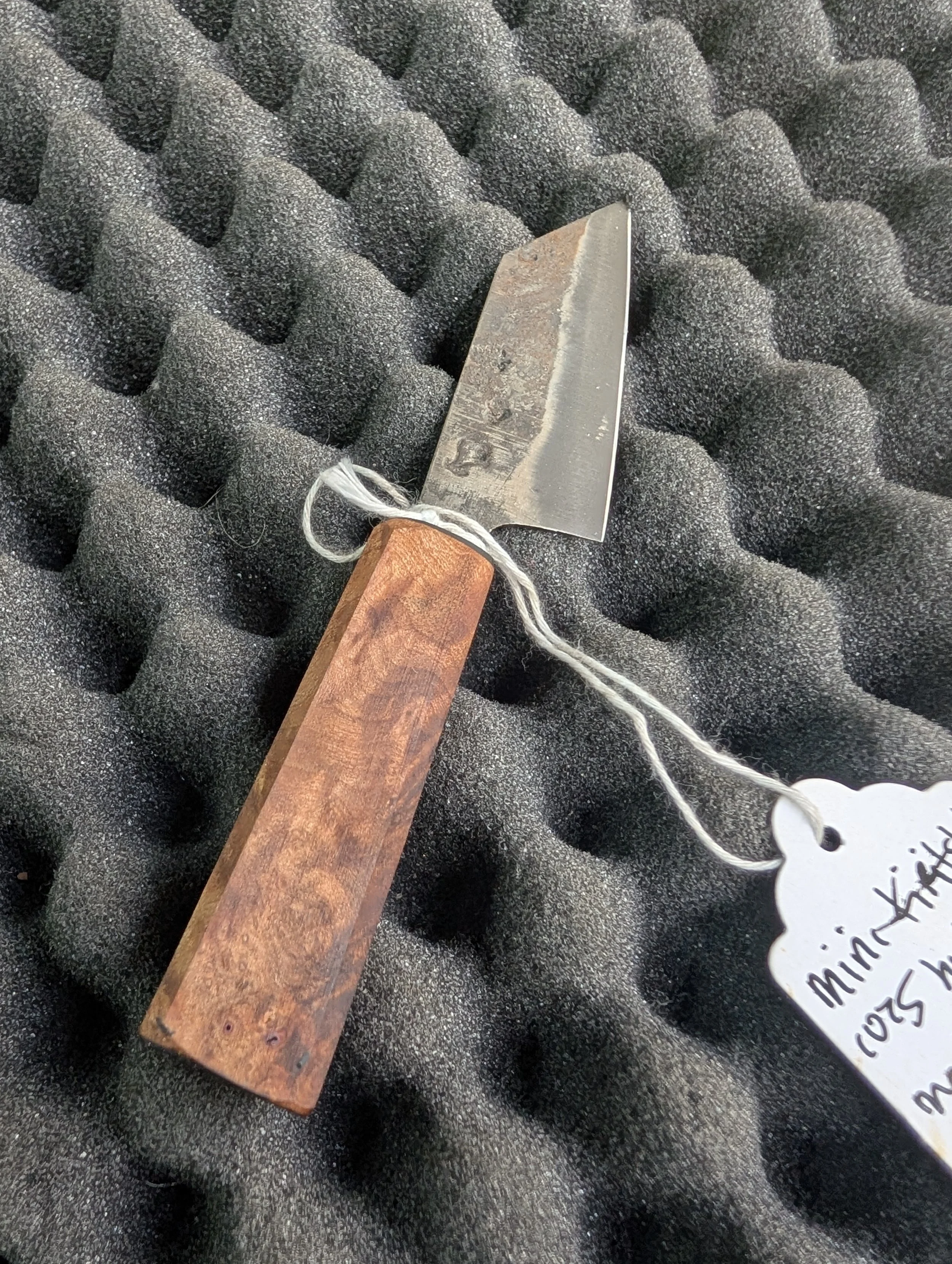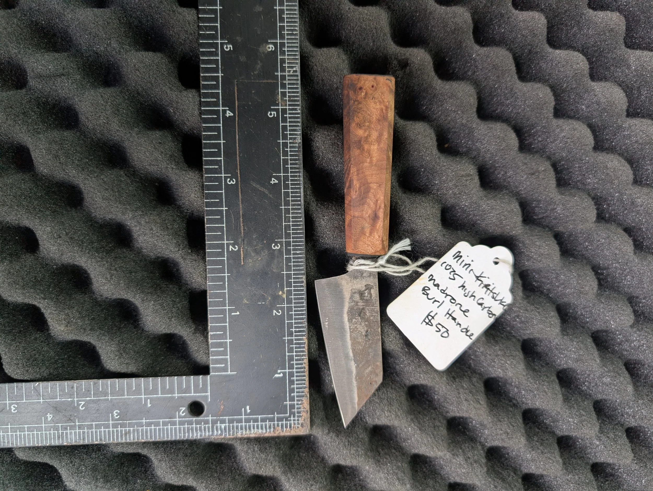 Browse › Mini Kiritsuke + Madrone Burl handle Image 1 of 2 Image 2 of 2 Mini Kiritsuke + Madrone Burl handle $50.00 2.25” mini Kiritsuke blade forged from 1075 high carbon steel and dressed with a wild foraged madrone burl handle Purchase Added! 2.25” mini Kiritsuke blade forged from 1075 high carbon steel and dressed with a wild foraged madrone burl handle