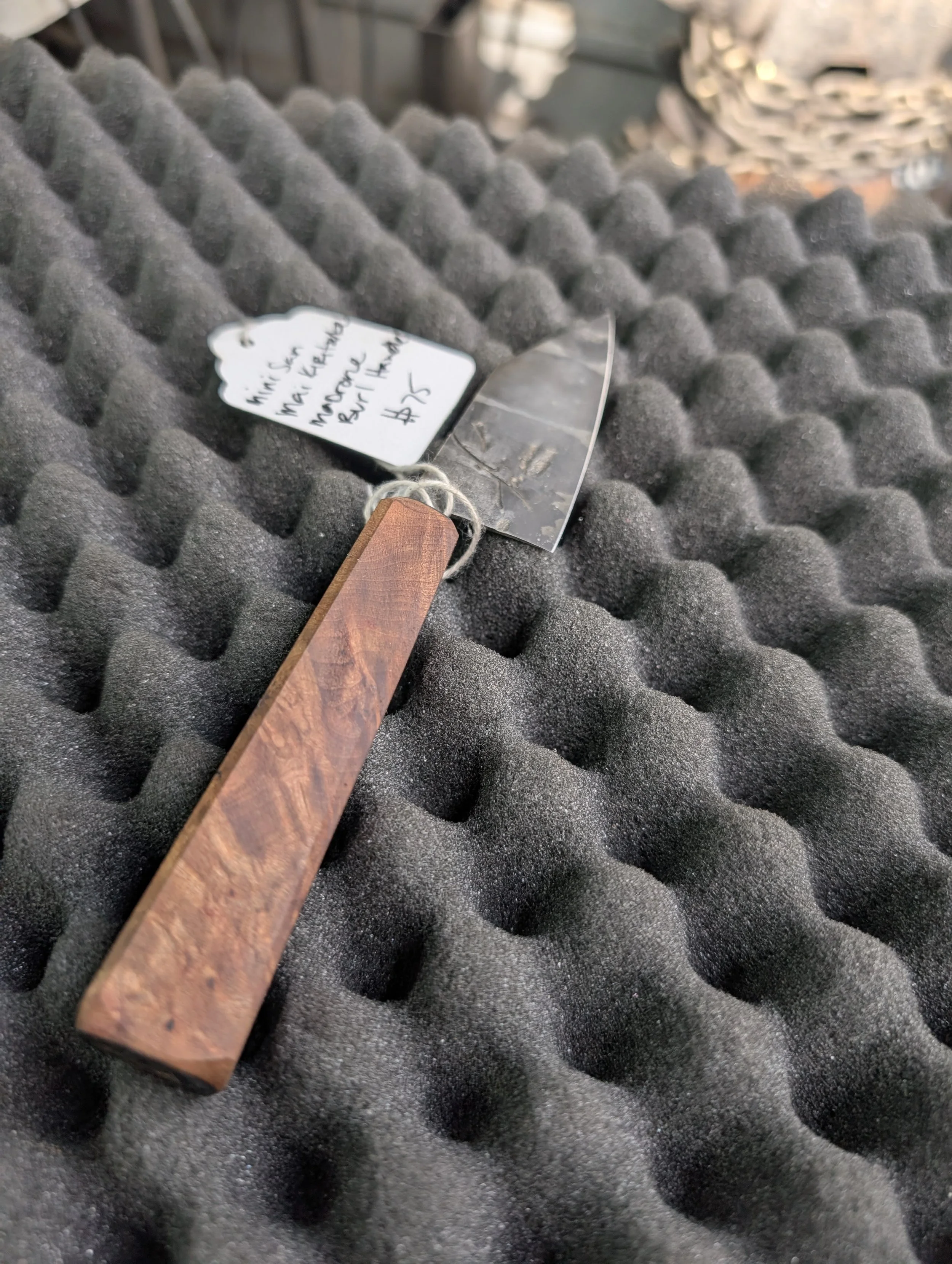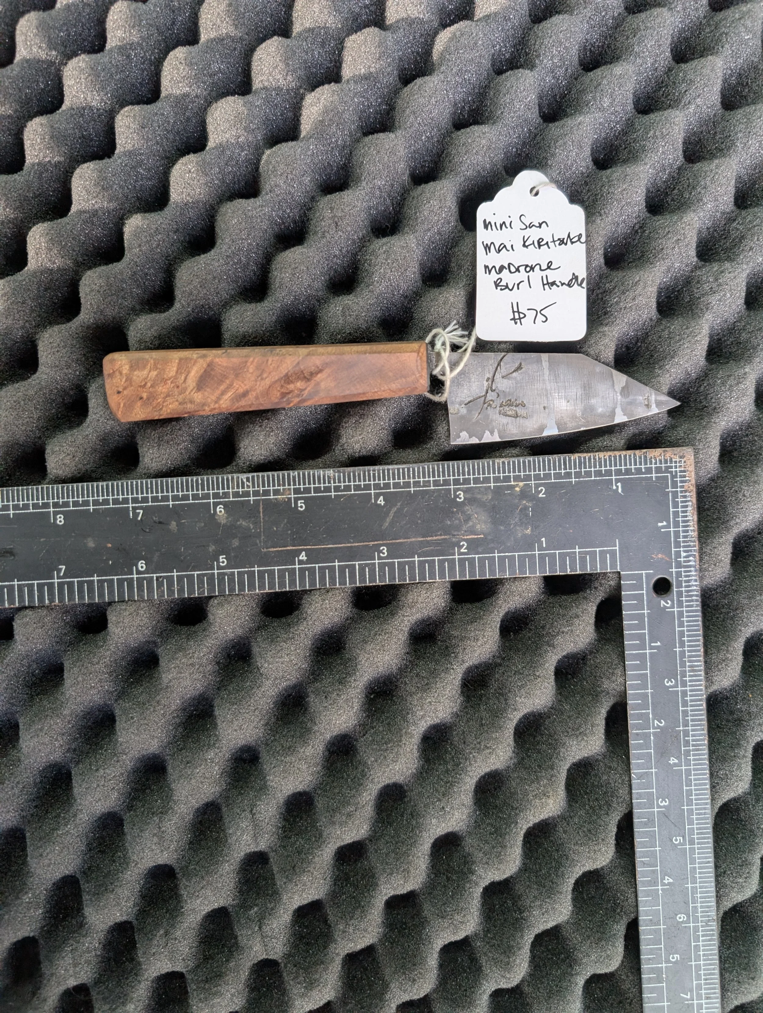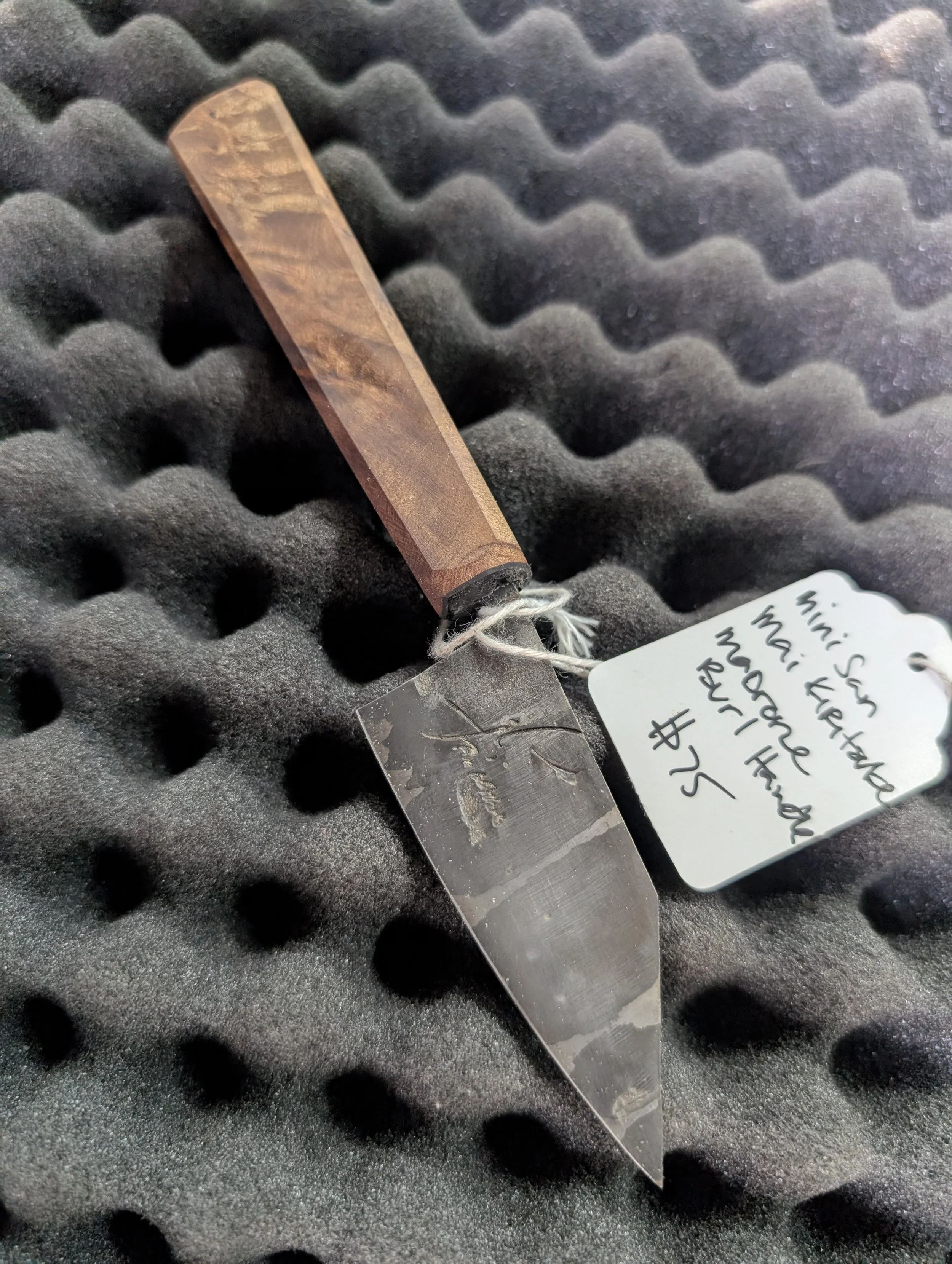 Browse › Mini San Mai Kiritsuke + Madrone Burl handle Image 1 of 3 Image 2 of 3 Image 3 of 3 Mini San Mai Kiritsuke + Madrone Burl handle $75.00 3” mini San Mai Kiritsuke blade forged from 1084+15n20 high carbon steels and fitted to a wild foraged madrone burl handle Purchase Added! 3” mini San Mai Kiritsuke blade forged from 1084+15n20 high carbon steels and fitted to a wild foraged madrone burl handle