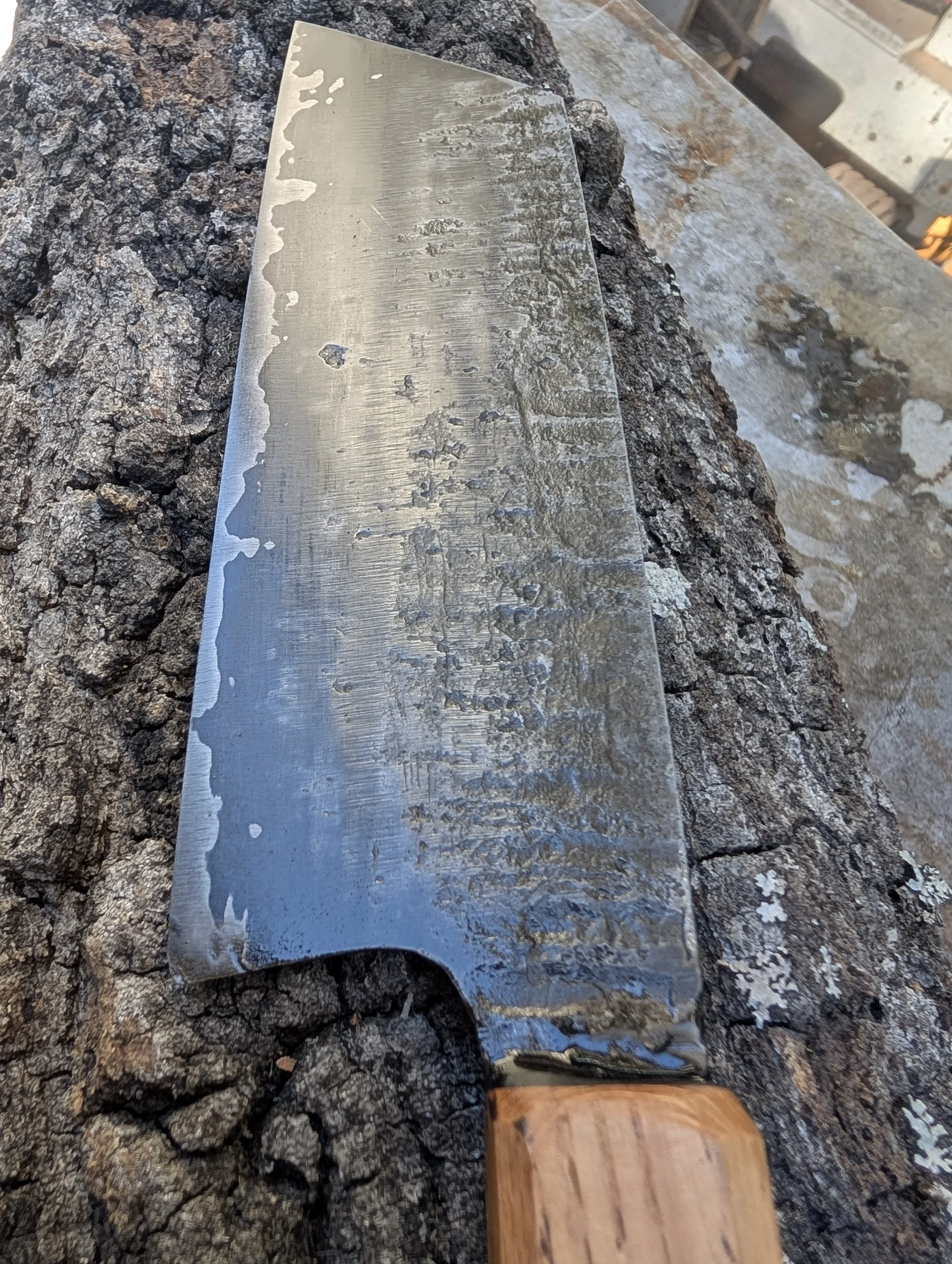 8” San Mai Bunka Forged from 1084/15n20 high carbon steels. Kurouchi+Hammered finish. Fat hidden tang