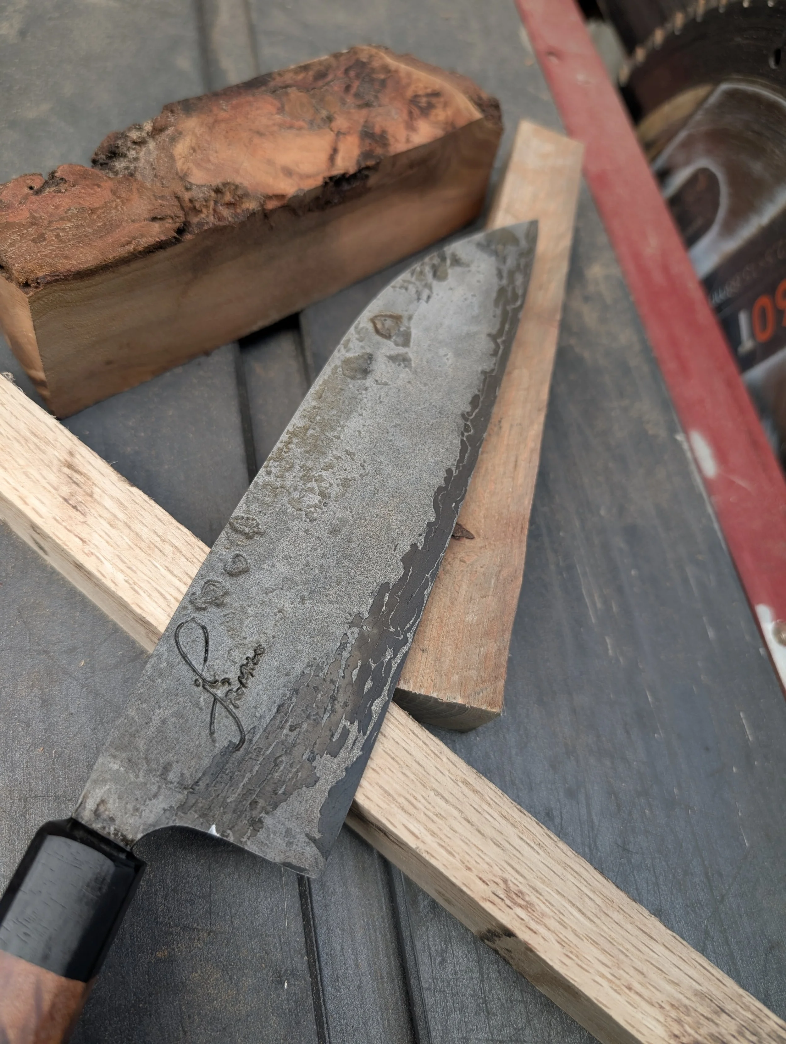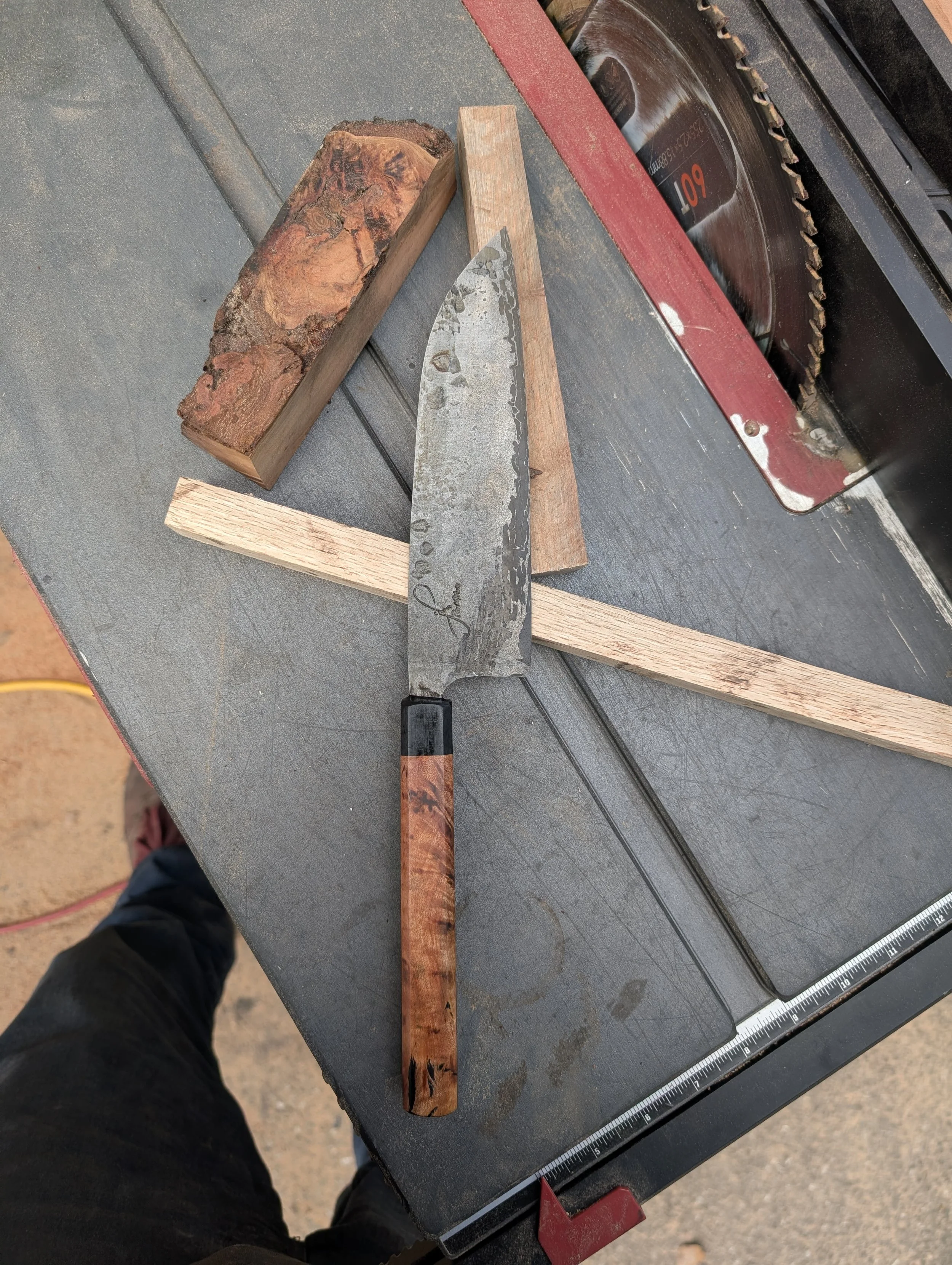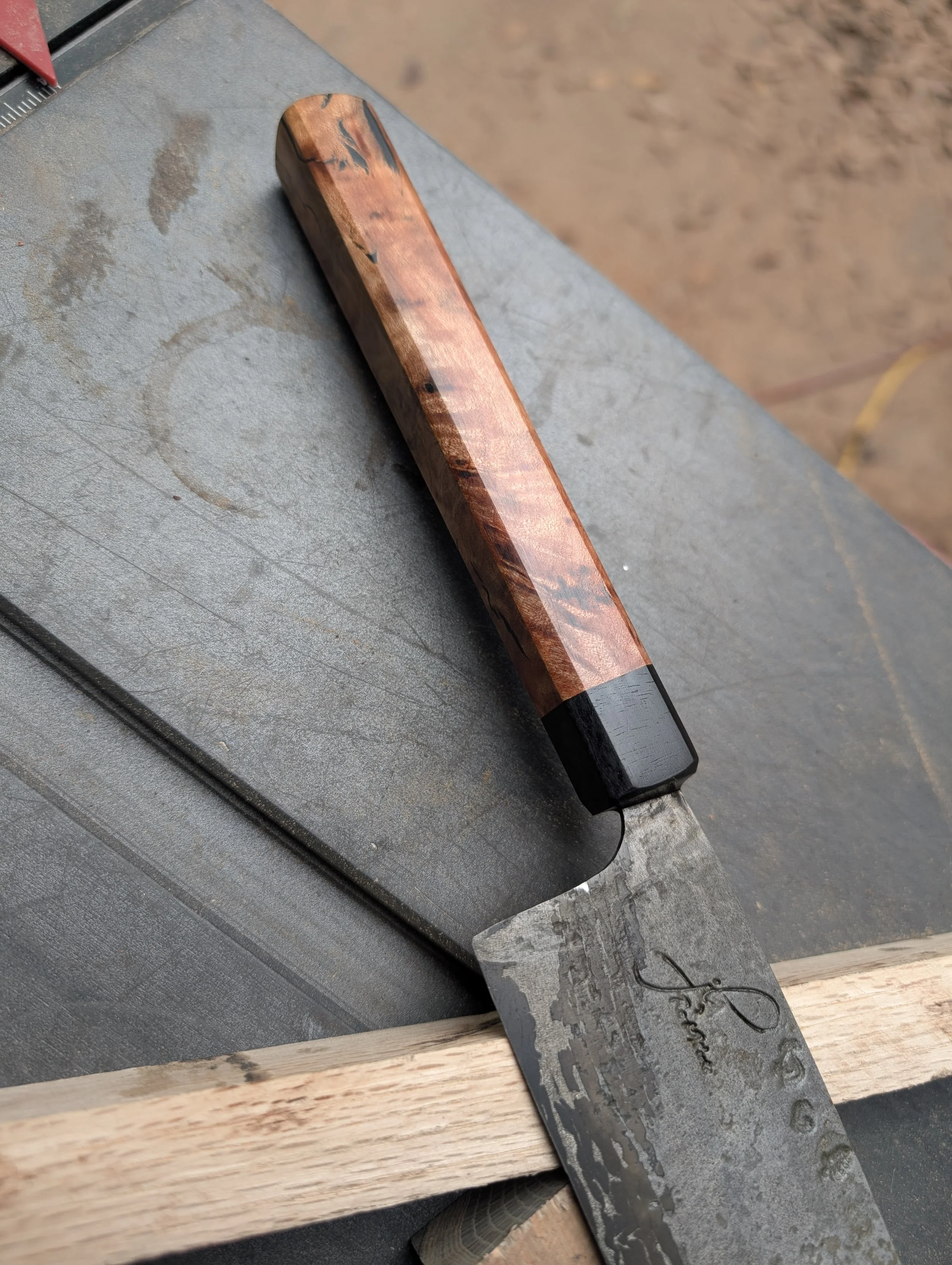 7.75” Santoku Forged From 1095 Bridge Cable in canister Damascus with 1090+4%Nickel powder steel. Handled up with wild foraged madrone burl from the Eel River in Mendocino County, accented with an ebony nose cap.