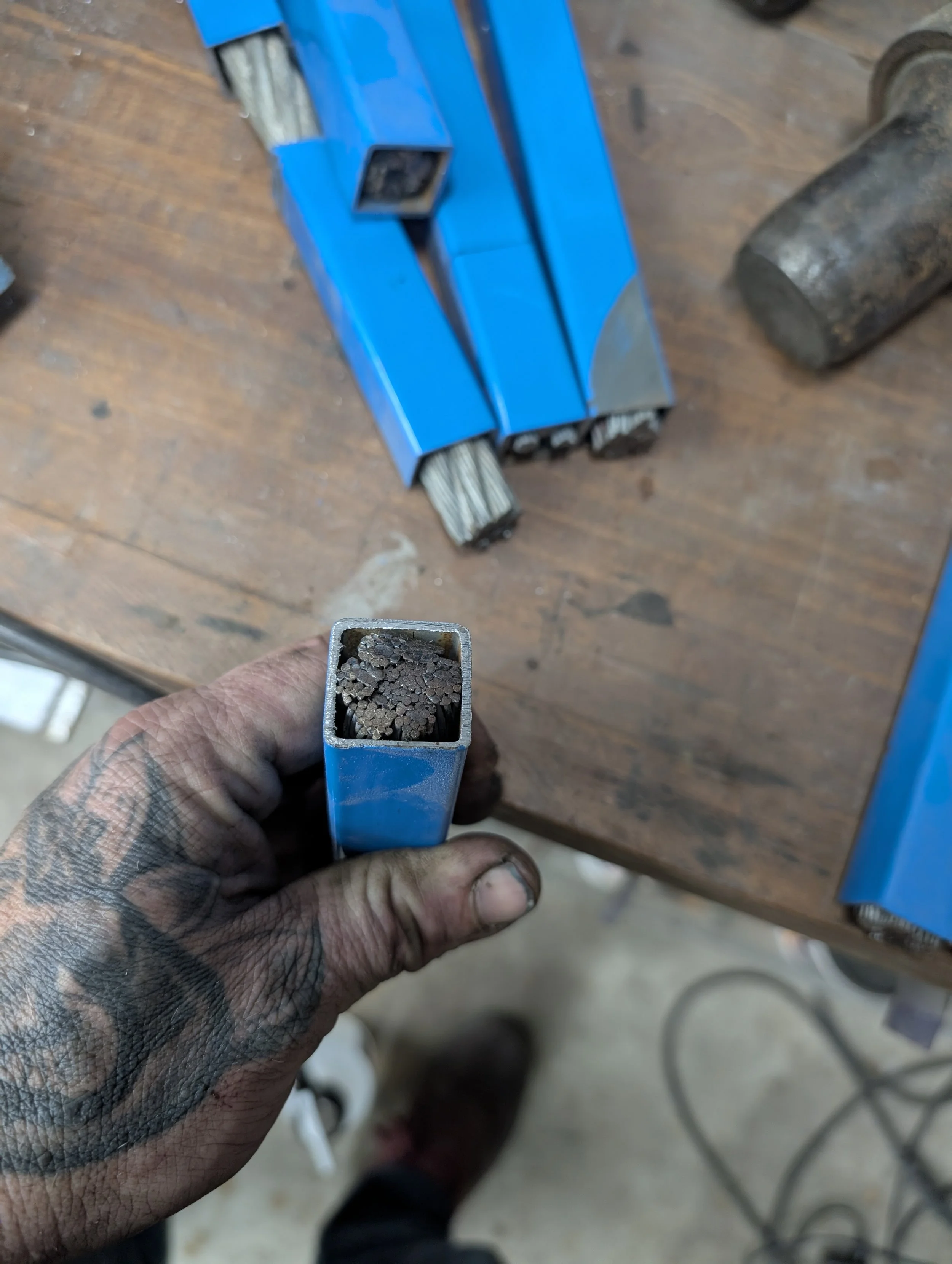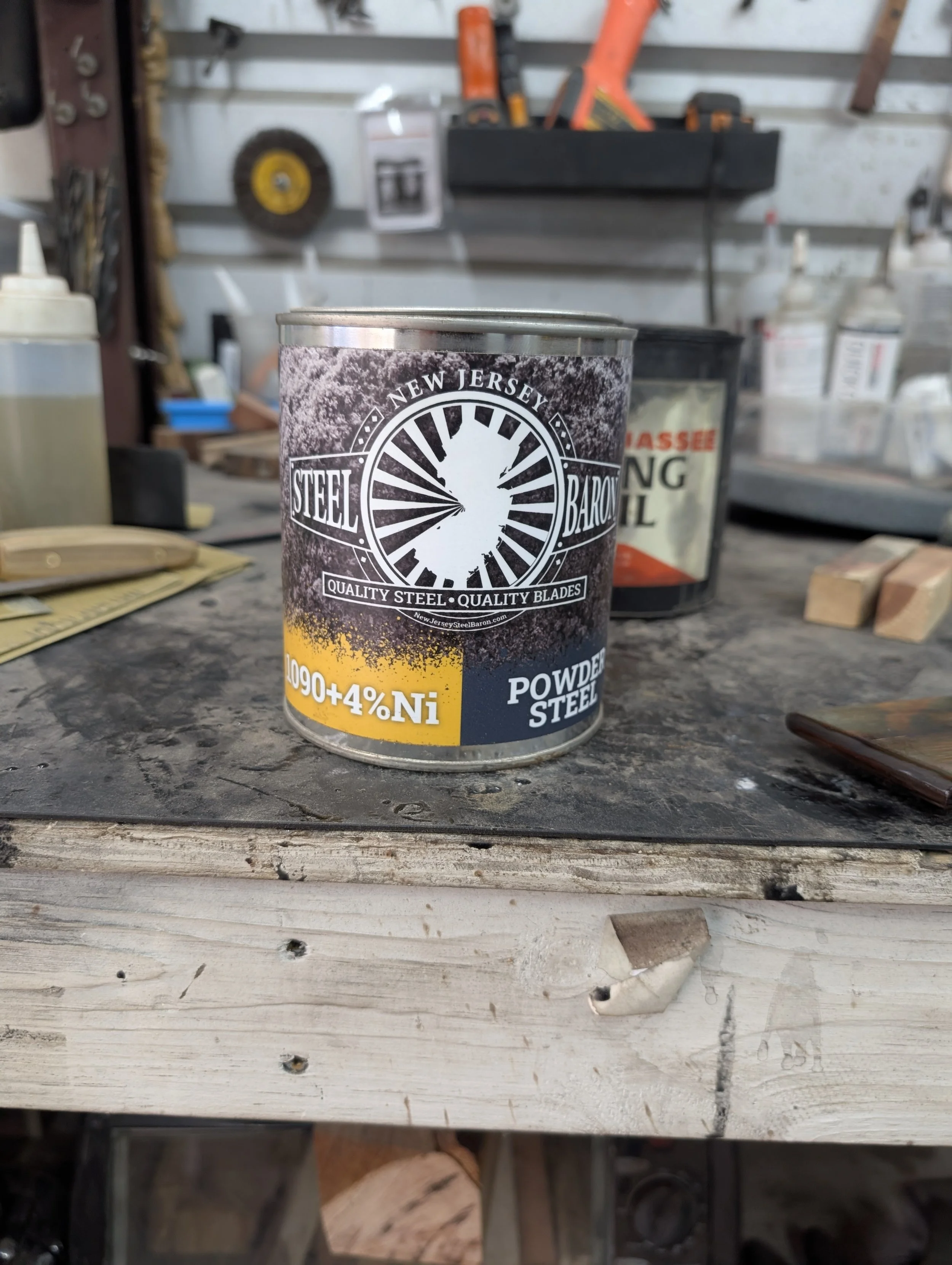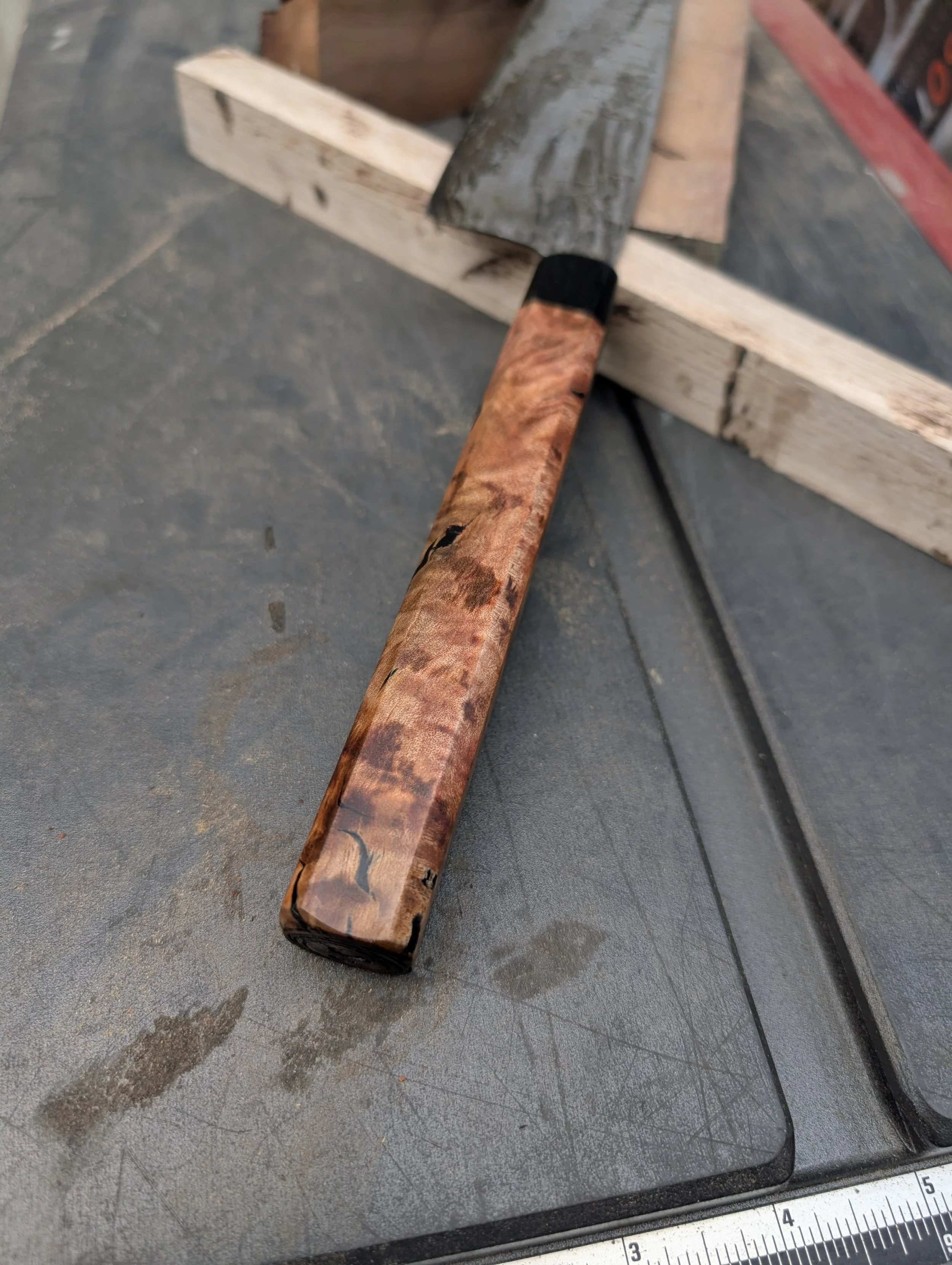 7.75” Santoku Forged From 1095 Bridge Cable in canister Damascus with 1090+4%Nickel powder steel. Handled up with wild foraged madrone burl from the Eel River in Mendocino County, accented with an ebony nose cap.