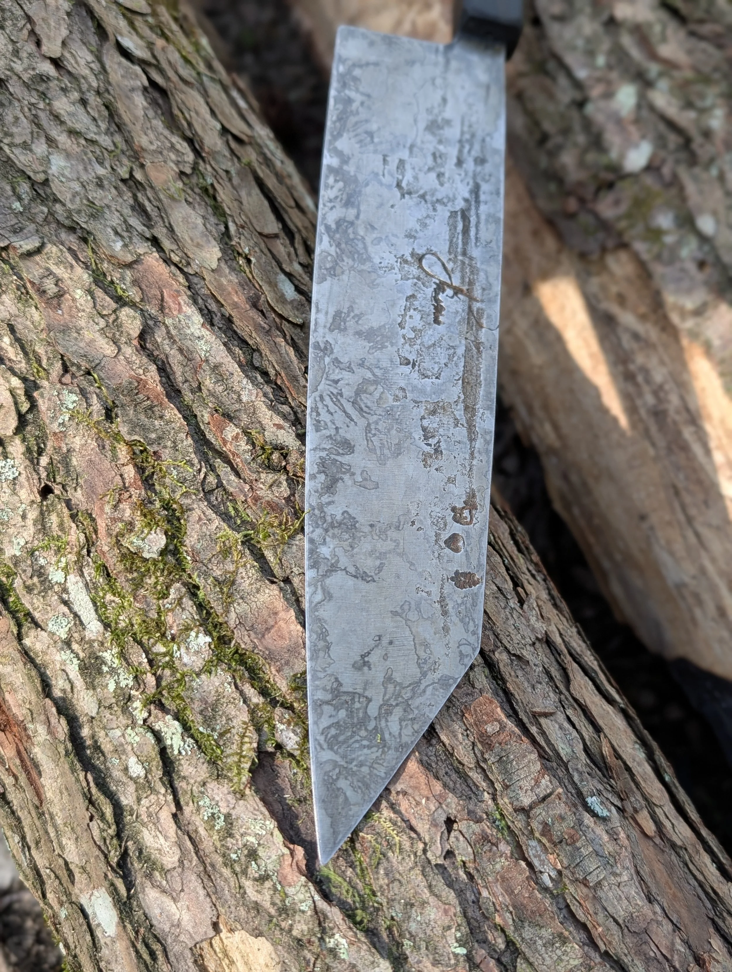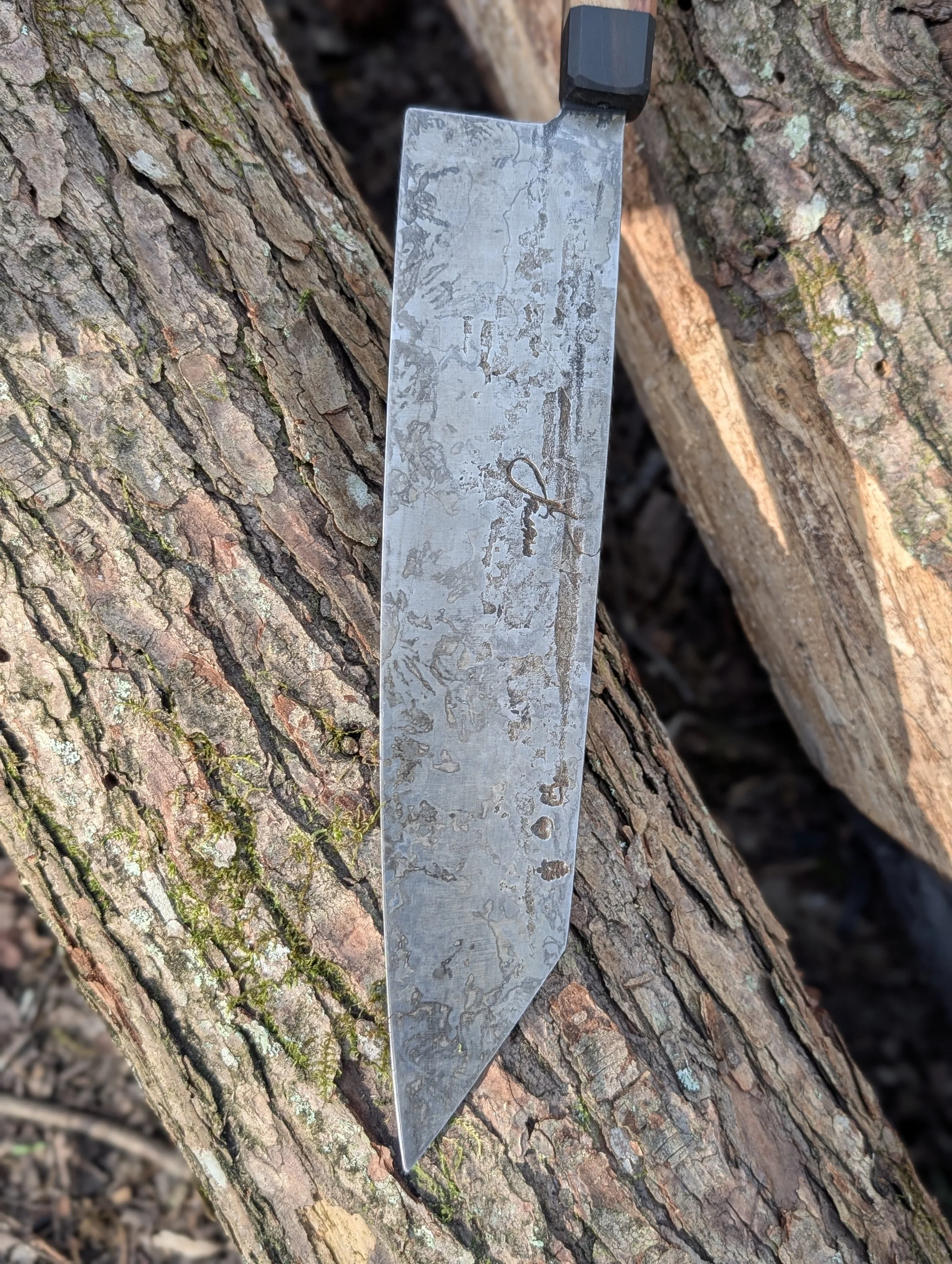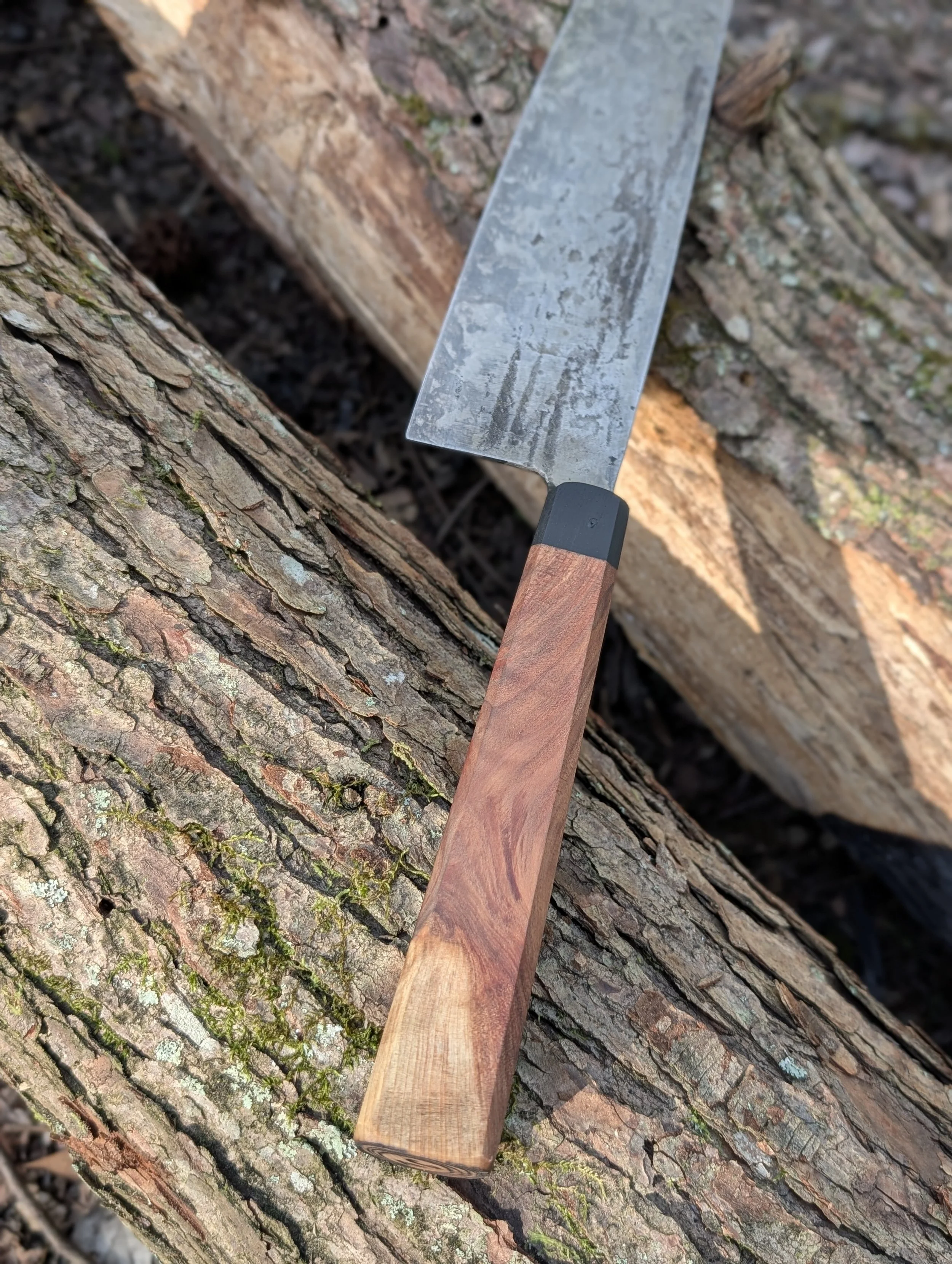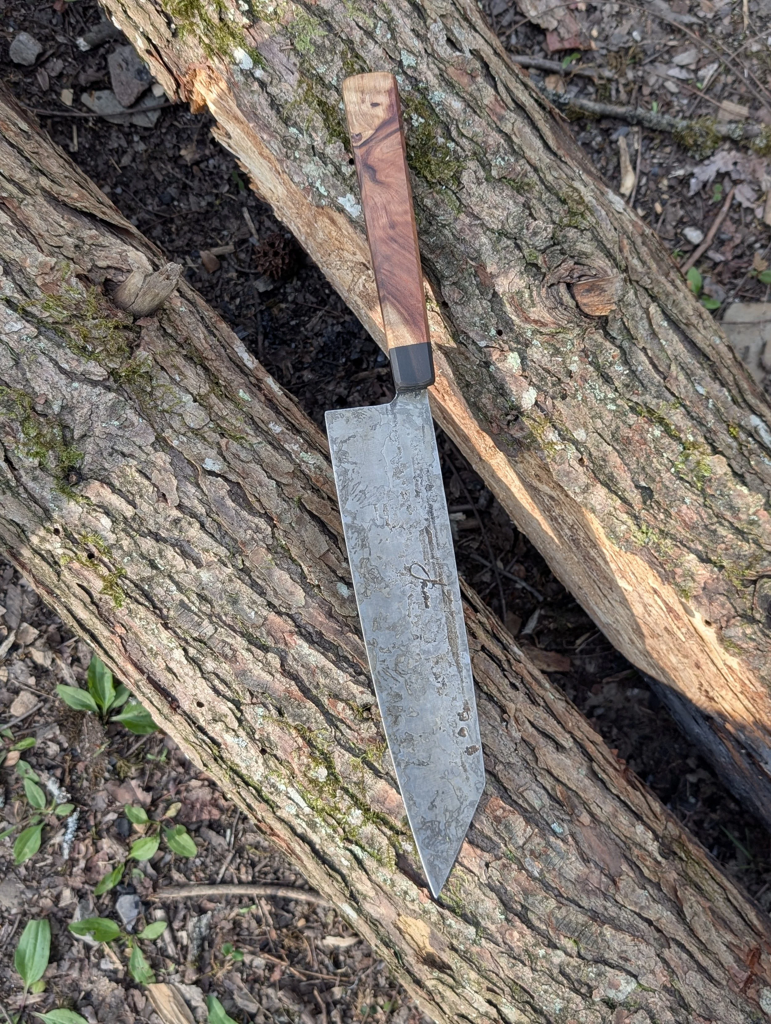 225mm Laser bevel kiritsuke forged from 1084 high carbon steel and mustard etched.